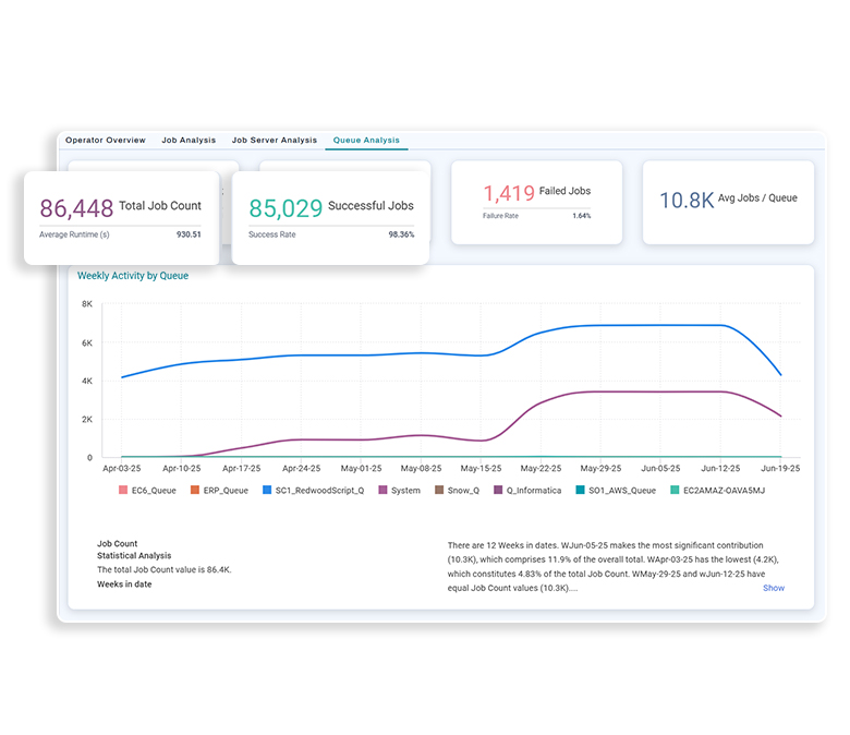 Available to all RunMyJobs by Redwood SaaS customers, Redwood Insights embeds observability directly into workload automation. Accelerate problem resolution, optimization and operational confidence.